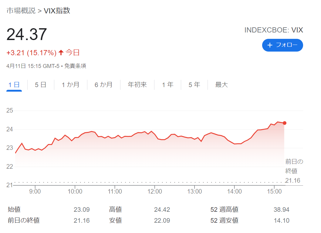 これに伴い、恐怖指数(VIX指数)は15%も急騰しました。